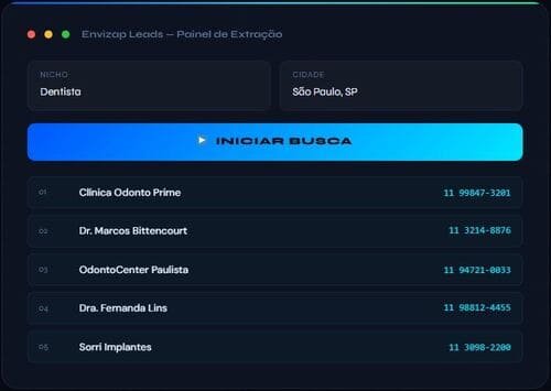 Envizap Leads extrai automaticamente nomes, telefones e sites de estabelecimentos — direto do mapa para sua planilha, sem digitar nada.